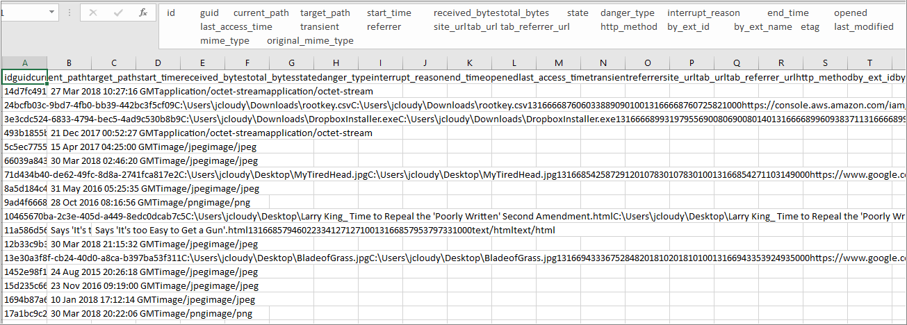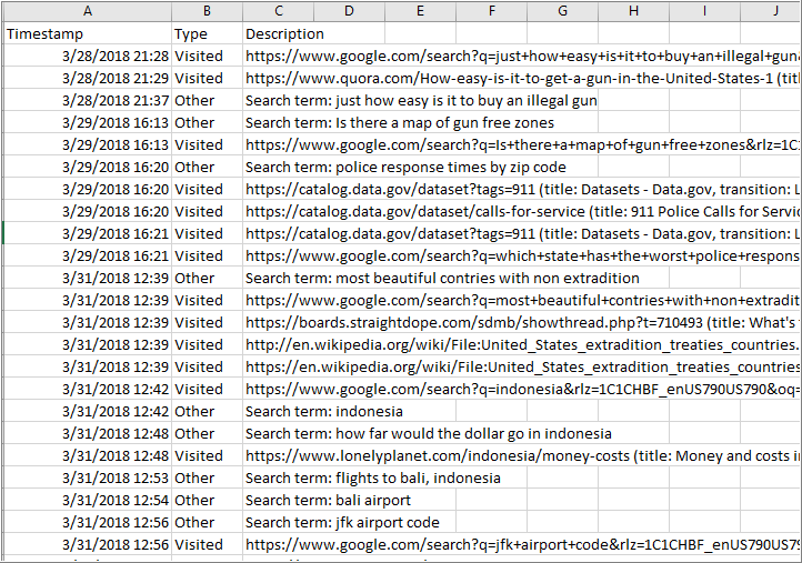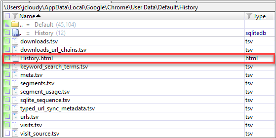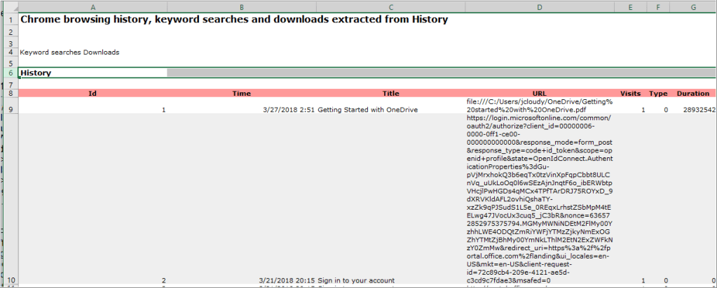Opening the HTML child object in Excel may offer additional flexibility through filtering and sorting. However, to ensure the columns are sorted properly, the tables for history, keyword searches and downloads need to be separated into their own sheet.