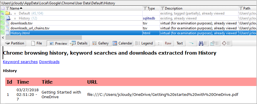 If selected as part of the volume snapshot refinement process, X-Ways Forensics will create HTML previews of Internet browser databases and extract tables as Tab Separated Values files from SQLite databases as child objects of the respective file (m. 6.3.3). The HTML preview is very accessible from the viewer component and may also be used to quickly report on the data extracted. Searches and indexing also benefit from the HTML preview and TSV files generated.