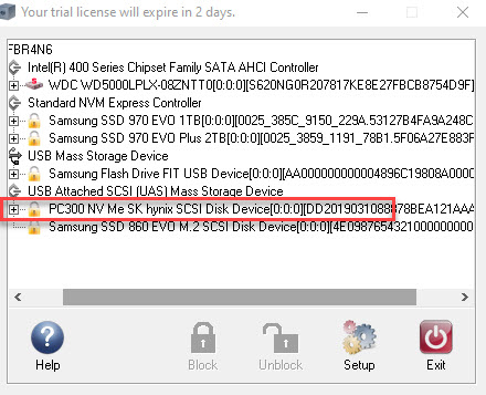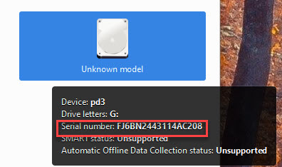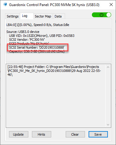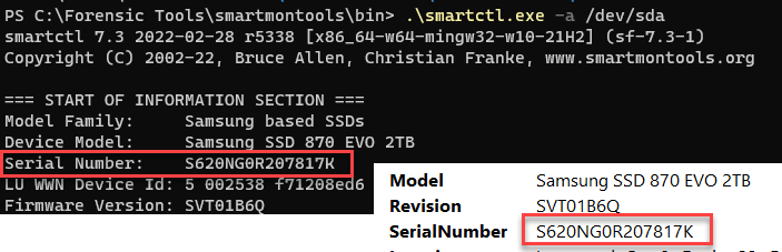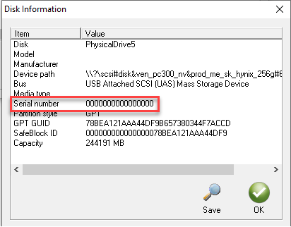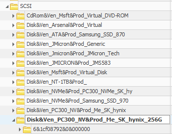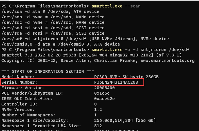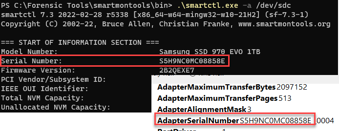 From the Device Manager, its model and manufacturer were listed appropriately. GSmartControl lists the drive as “Unknown”, but the preview was able to display the serial number printed on the SK Hynix SSD’s label. The SYSTEM registry SCSI key for the SSD has a value that includes “&” as the second character. The Microsoft-Windows-Partition/Diagnostic.evtx reports another number that matches the number reported by SAFE Block and Guardonix. With smartctl.exe and the WiebeTech WriteBlocking Utility, the serial number matches the serial number on the SSD.