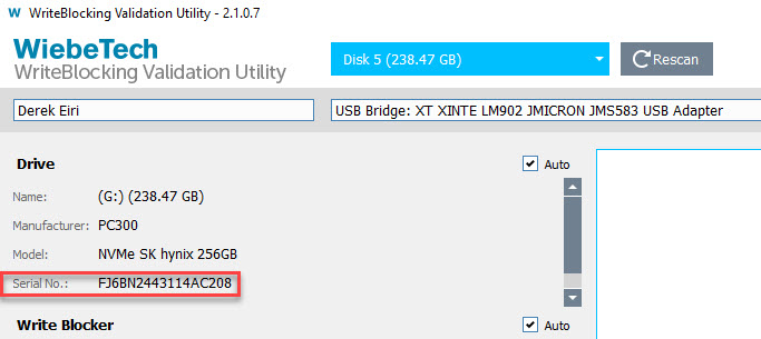 I tested write blockers personally available to me and noted general speed observations and how “serial numbers” are reported by different tools. I also briefly considered how I might verify the serial number of a Windows OS system drive and view SMART attributes for M.2 NVMe SSDs.