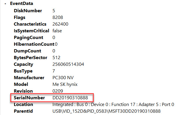 Serial numbers: Almost always, an M.2 NVMe SSD is the system drive of a target machine running a Windows OS. If I needed a sanity check on the serial number, I can review the Microsoft-Windows-Partition/Diagnostic.evtx log, Event ID 1006.