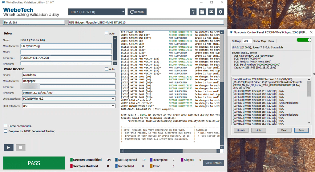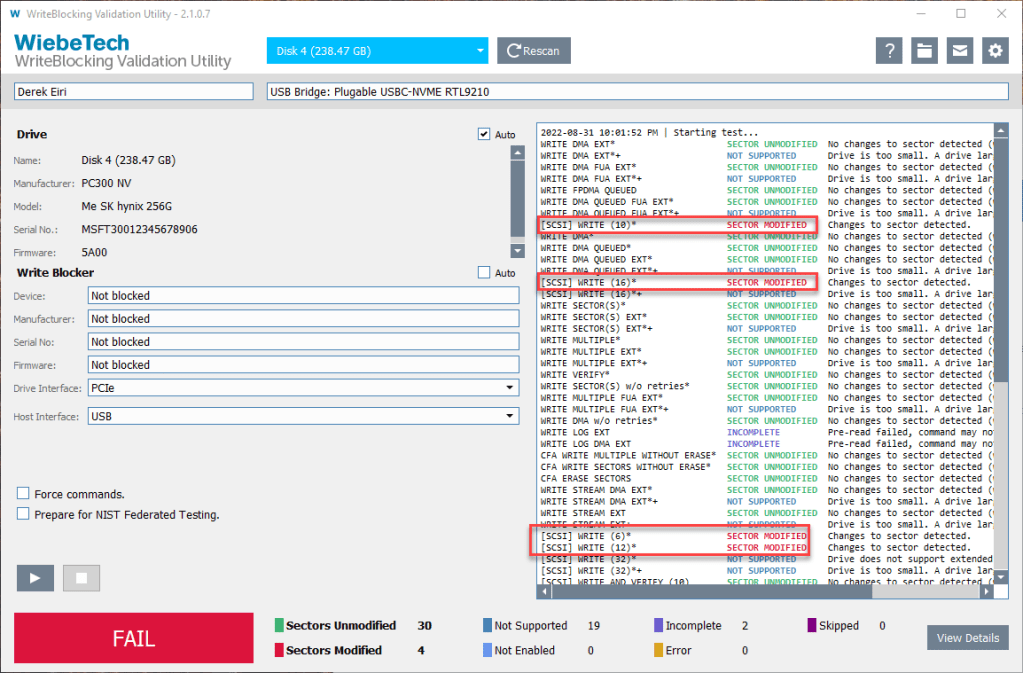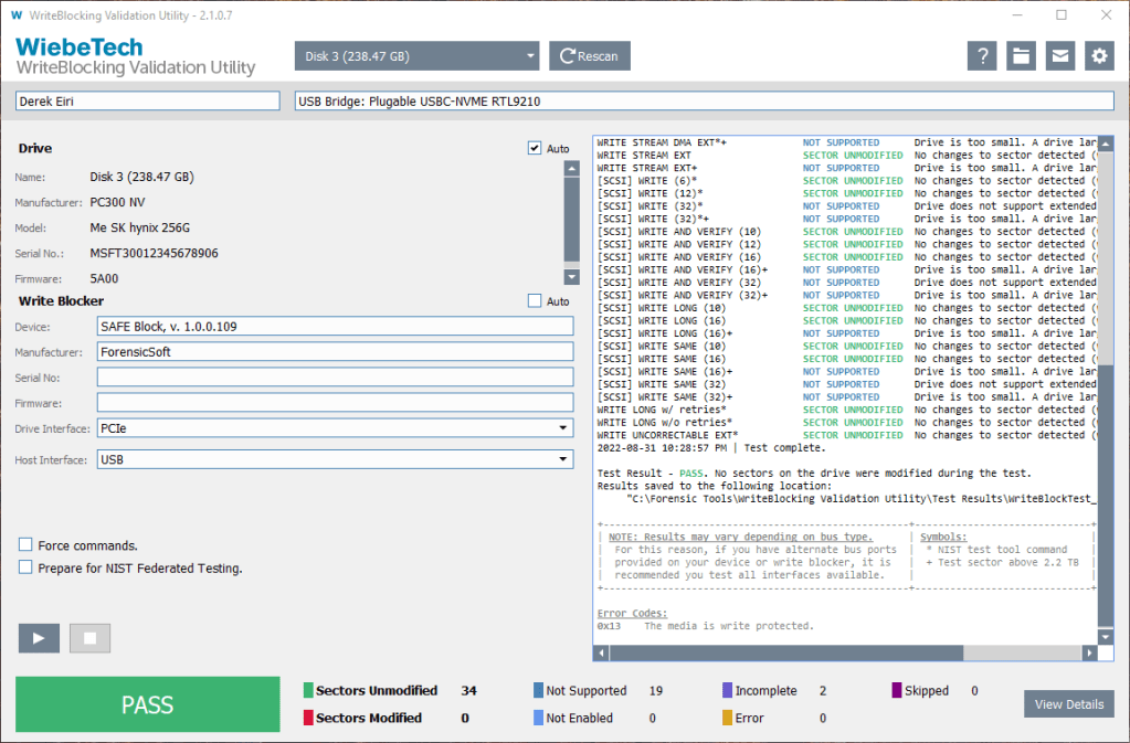 Note: SAFE Block tests with SATA or M.2 NVMe SSDs via USB adapters presented serial numbers that were not of the drive. ForensicSoft states SAFE Block fully supports all ATA and SCSI commands, to include all pass-through commands. This may mean I need to identify a tool that will.