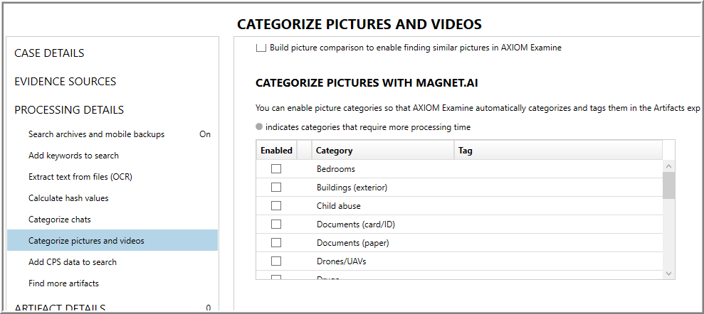 Enabling picture categorization with AXIOM is simple as checking a few boxes. A handful of categories do require additional processing time. I selected “bedrooms”, “buildings”, “human faces”, “weapons”, “human hands”, “militants”, “vehicles”, and “tattoos”. For a quick introduction, Jamie McQuaid of Magnet Forensics created a video working with Magnet.AI.