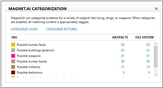 Magnet Forensics introduced picture categorization with AXIOM v1.1 and added the weapons category with v2.0. Other categorizes included may be viewed in the Magnet AXIOM User Guide.