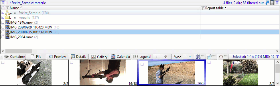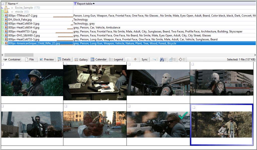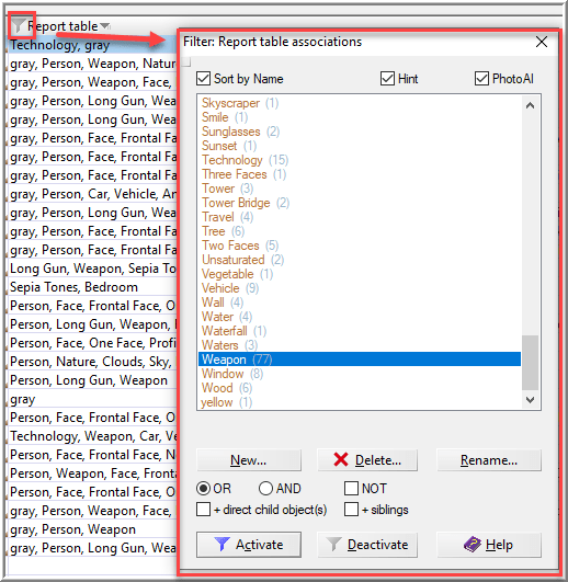 XWF supports logical AND and OR combinations. Since I saved the output in the Report table associations column, I can filter for “Weapon” AND “Face”. After excluding stills extracted from video, this resulted in 11 matches of the 36 possible images from the entire sample (31%).