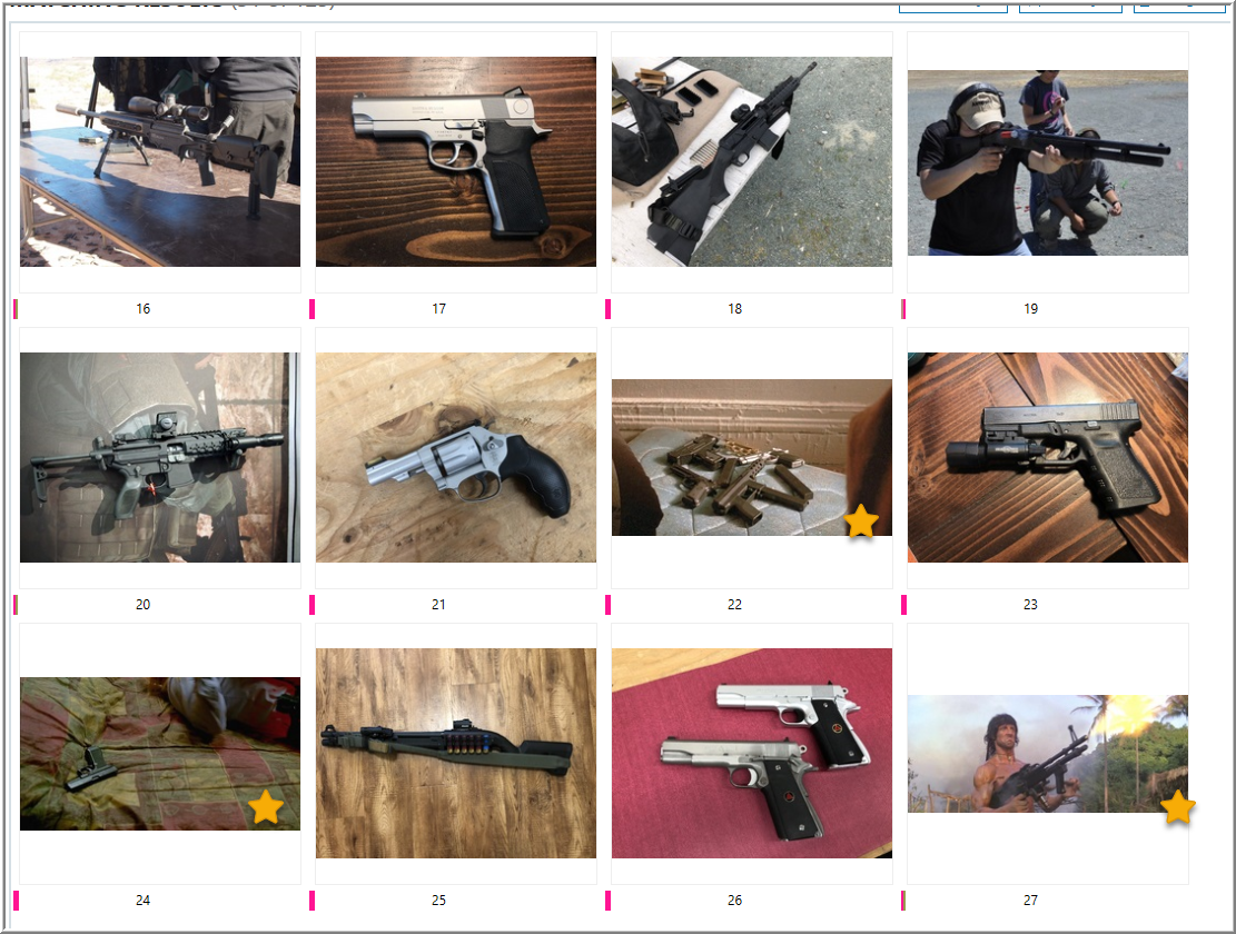 Thumbnail view in AXIOM of pictures tagged with “Possible weapons”. The stars marks samples from the IMFDb.