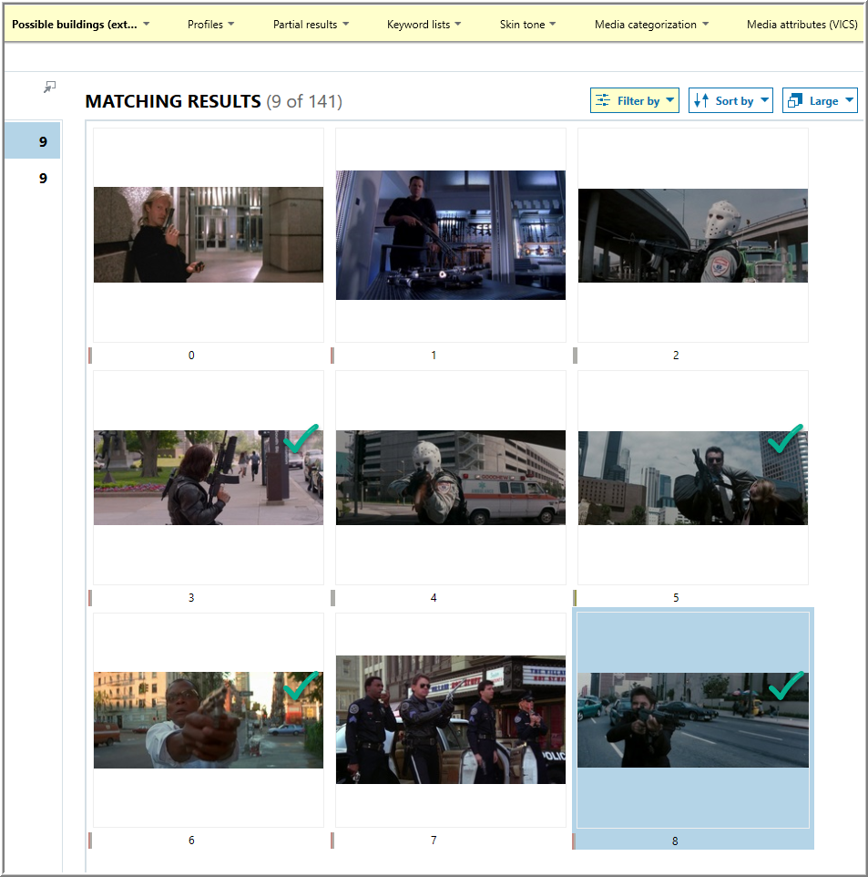 In AXIOM, I selected categories detected in the case from the IMFDb sample with a logical OR that I perceived to be associated with an urban environment: “Possible buildings (exterior)”, and “Possible Vehicles (cars/trucks/vans/buses)”. This resulted in 8 pictures of 10 possible.