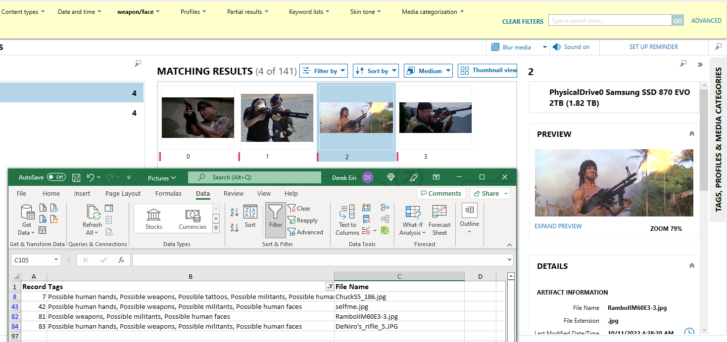 AXIOM combines tags using a logical OR; however, it is not capable using a logical AND. To get around this, I create an Excel report of tagged items and filter the list using Excel. My target are the file names with the tags “Possible Weapons” and “Possible Human Faces”, so I filter for rows that only contain “weapons” AND “faces” in the Tags column. This resulted in 4 matches of the 36 possible images from the entire sample (11%).