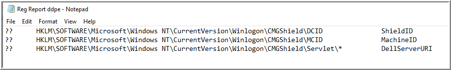 | Dell Server URI | HKLM\SOFTWARE\Microsoft\Windows NT\CurrentVersion\Winlogon\CMGShield\Servlet |