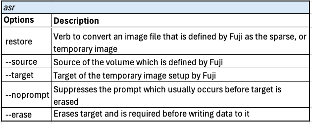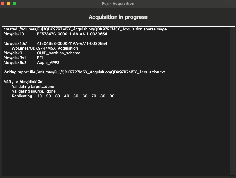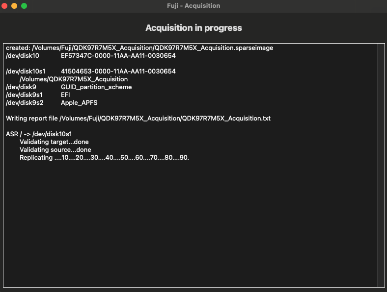 In Fuji, asr.py establishes the parameters to prepare an Apple Software Restore including the acquisition report. It then issues the asr command to restore the root volume and saves it to the temporary image set up by Fuji. When the temporary image is erased and data begins to save data to the target, the prompt to confirm to erase its contents is ignored.