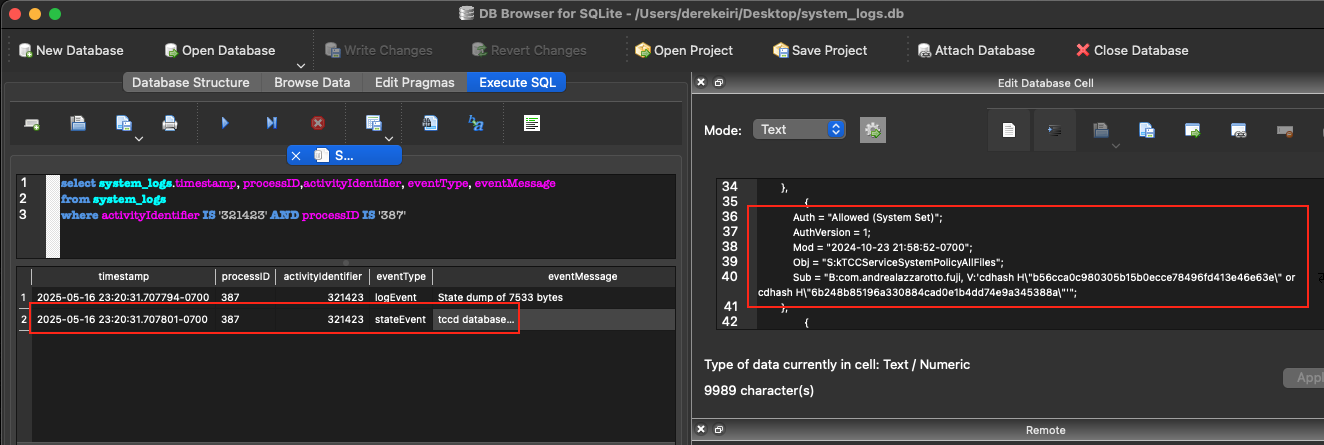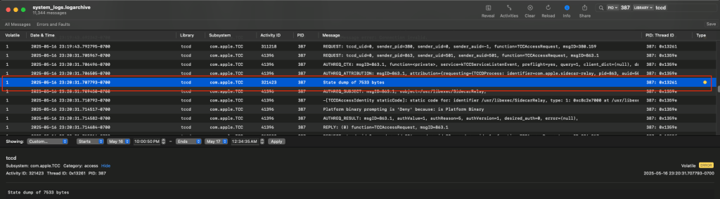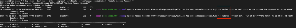 From Edwards’ research, the entries were “removed anywhere from about 1 hour to 1h40m.” It seems with state dumps of the TCC database recorded with Unified Logging, it may provide the status of an app’s permission as it was about 7 days earlier.