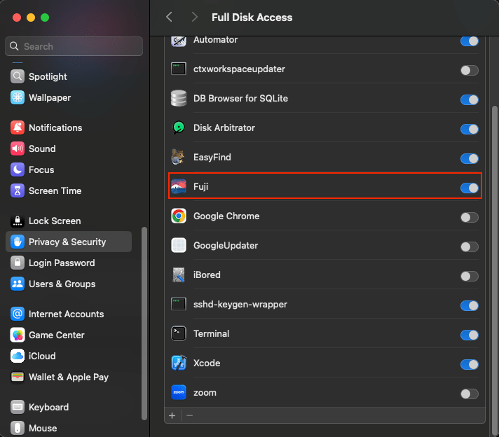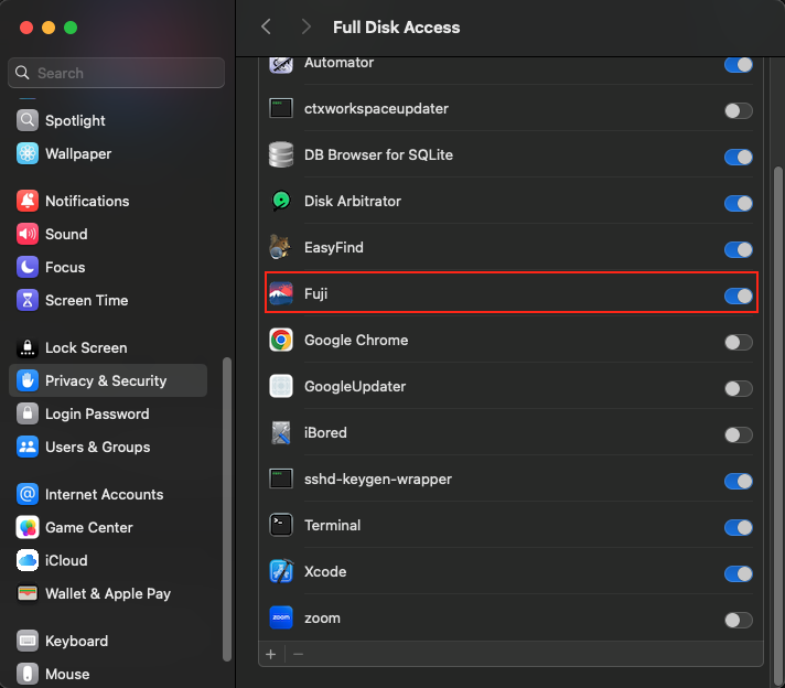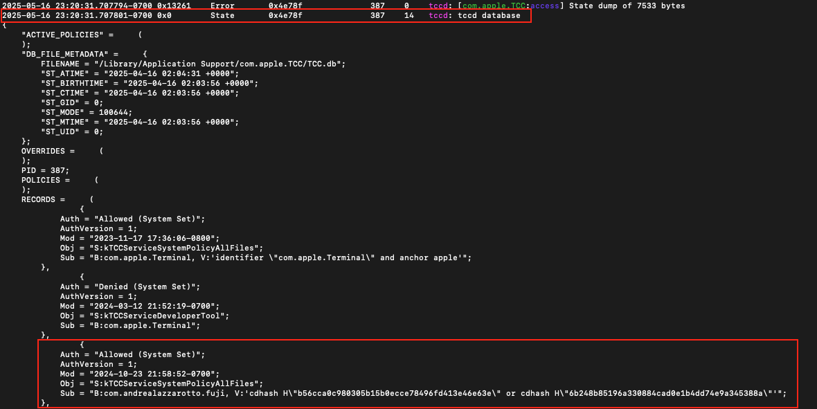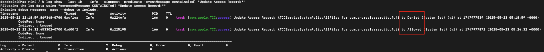 Tangent: Reviewing the state dump, I was reminded of Sarah Edwards’ research on tracking app permissions. Here, I’m just switching Fuji’s Full Disk Access permissions.
