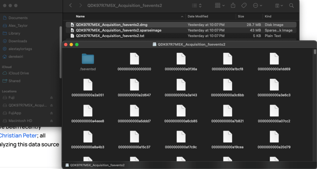 The rsync command was featured in Sumuri’s MFSC-101 and MFSC-201 class as a method to logically copy data from a live Mac and preserve Apple Extended Attributes. It may also be piped after the find command of certain files, then copy to a destination. Fuji explains that while rysnc is slower, it may be used on any source directory. The .fsevents directory is a perfect candidate for this method.