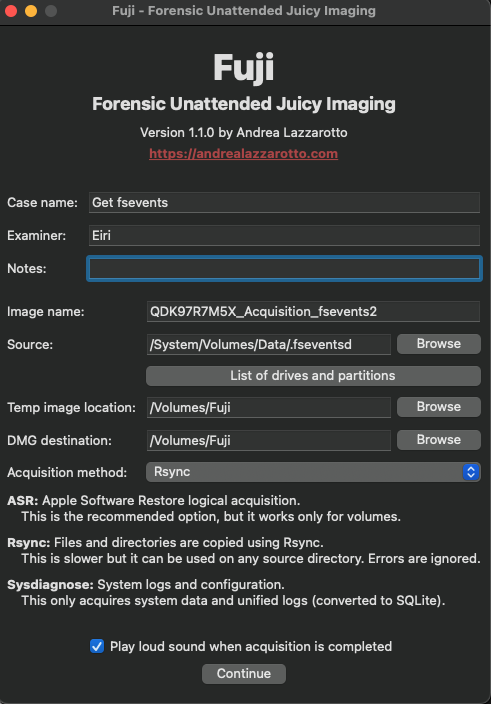 Fuji is an acquisition tool that logically collects data from macOS machines with a simple graphical user interface. It is capable of three acquisition methods: Asr collects data from volumes, Rsync collects data from directories, and Sysdiagnose collects system data and Apple Unified Logs. Fuji also converts Apple Unified Logs to an SQLite database.