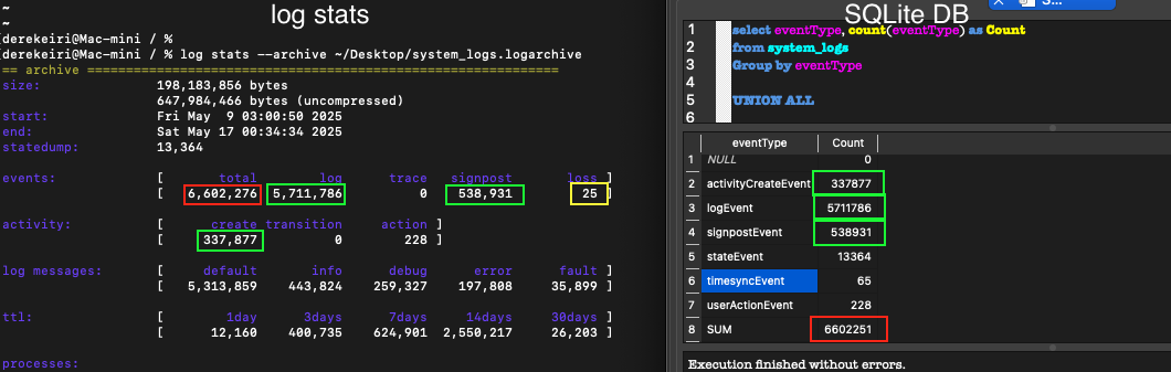 Fuji handles each valid event quite well. Though the total counts from each method are different, it seems the “loss” events contribute to the total events counted with the log stats command compared to the total queried against system_logs.db (FYI: Notari wrote about how the log stats command works, and incidentally, is used in his parsing tool, here).