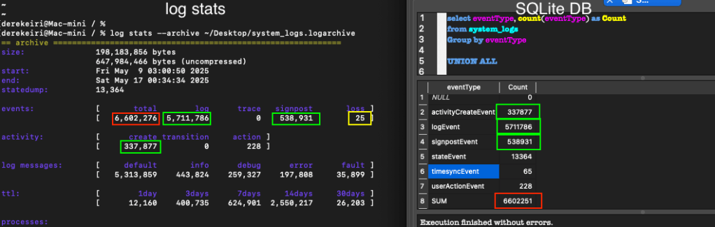 For me, the flexibility between querying SQLite database and running the log stats command makes the data more accessible.