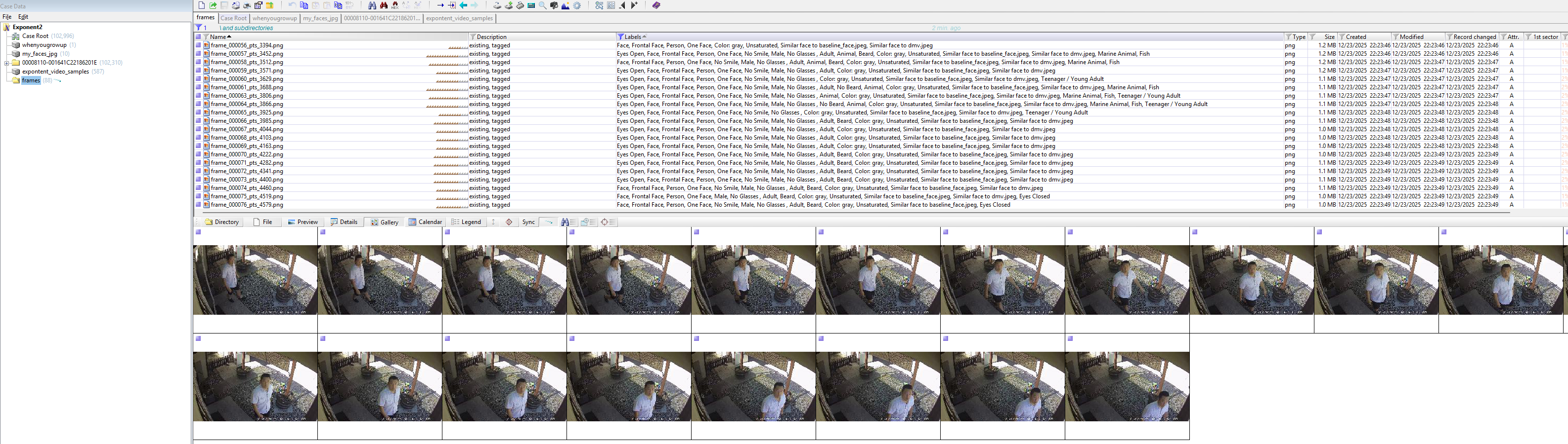 For funsies, I ran Excire in X-Ways Forensics against the output directory of the extracted frames. Frame-counts-galore extracted 88 frames. Using Excire, 20 extracted frames contained a face that matched dmv or baseline_face. This could be another way to extract more frames from video for X-Ways Forensics to process through Excire.