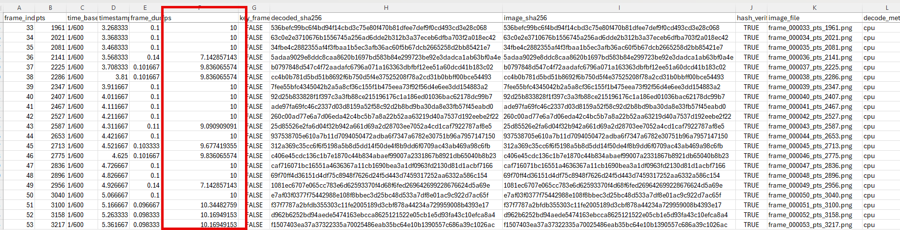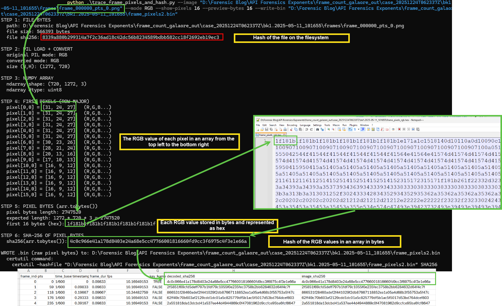 I especially appreciated Brignoni’s explanation how the script hashes the _RGB pixel data_ of each frame before it is written to the file system, then hashes the _RGB pixel data_ again after the extracted frame is written and reloaded. This is to demonstrate that not only each frame is unique, but the pixel data before and after the exaction is the same.