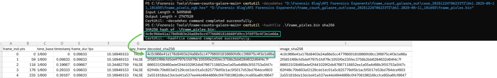 To visualize this process for a single extracted frame, I printed the first few RGB values, then printed a preview of the corresponding byte stream in hex. I also wrote the full byte stream to a .hex file, decoded that hex back into a raw .bin file, and hashed the .bin so certutil was hashing the same bytes.