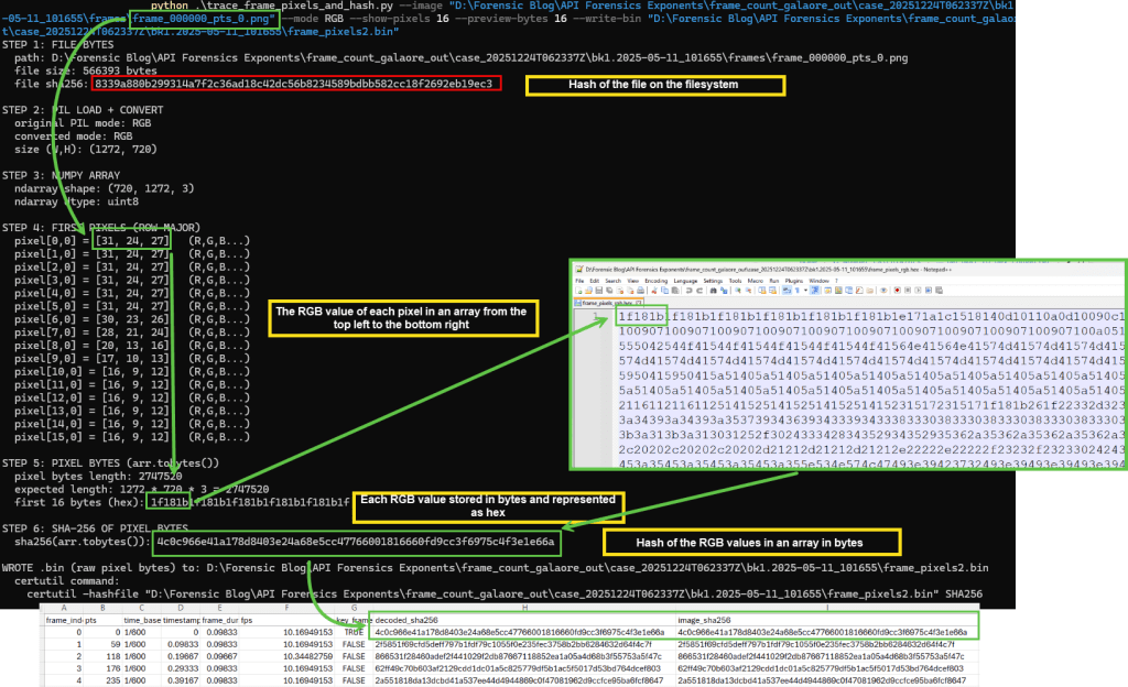 To explore this further, I used ChatGPT to break the concept into smaller parts so I could visualize each step using the outputs from frame-counts-galore as a baseline: a single extracted frame and the hash of the RGB pixel data the script calculated for it.